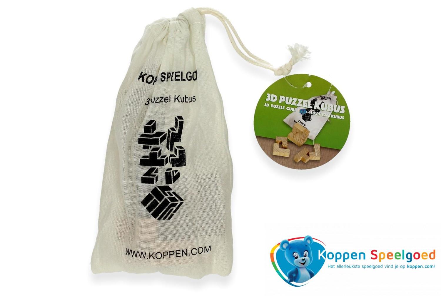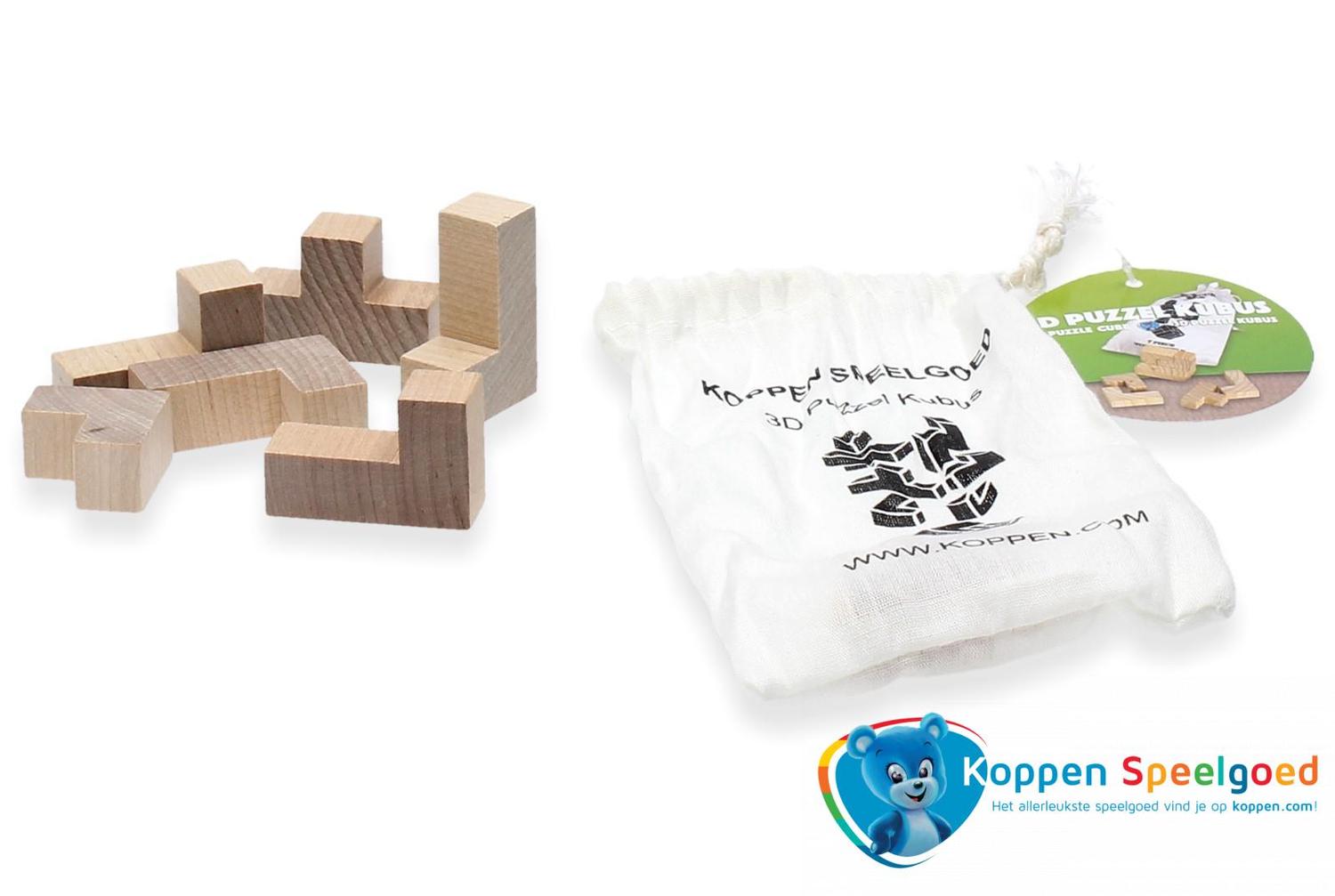 3D puzzel kubus in zakje, hout. Lukt het jou om van deze zeven stukjes een kubus te maken? Geleverd in zakje, zodat het na het spelen weer makkelijk is op te bergen. Dit houten speelgoed is geschikt voor kinderen vanaf drie jaar.