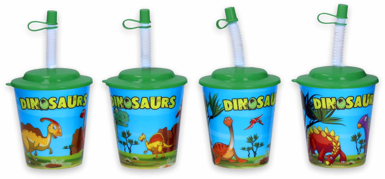 Beker met deksel en rietje, dino. Deze set bestaat uit een beker, deksel en een rietje. De inhoud van de beker is 240 ml. Leuk voor bij feestjes.