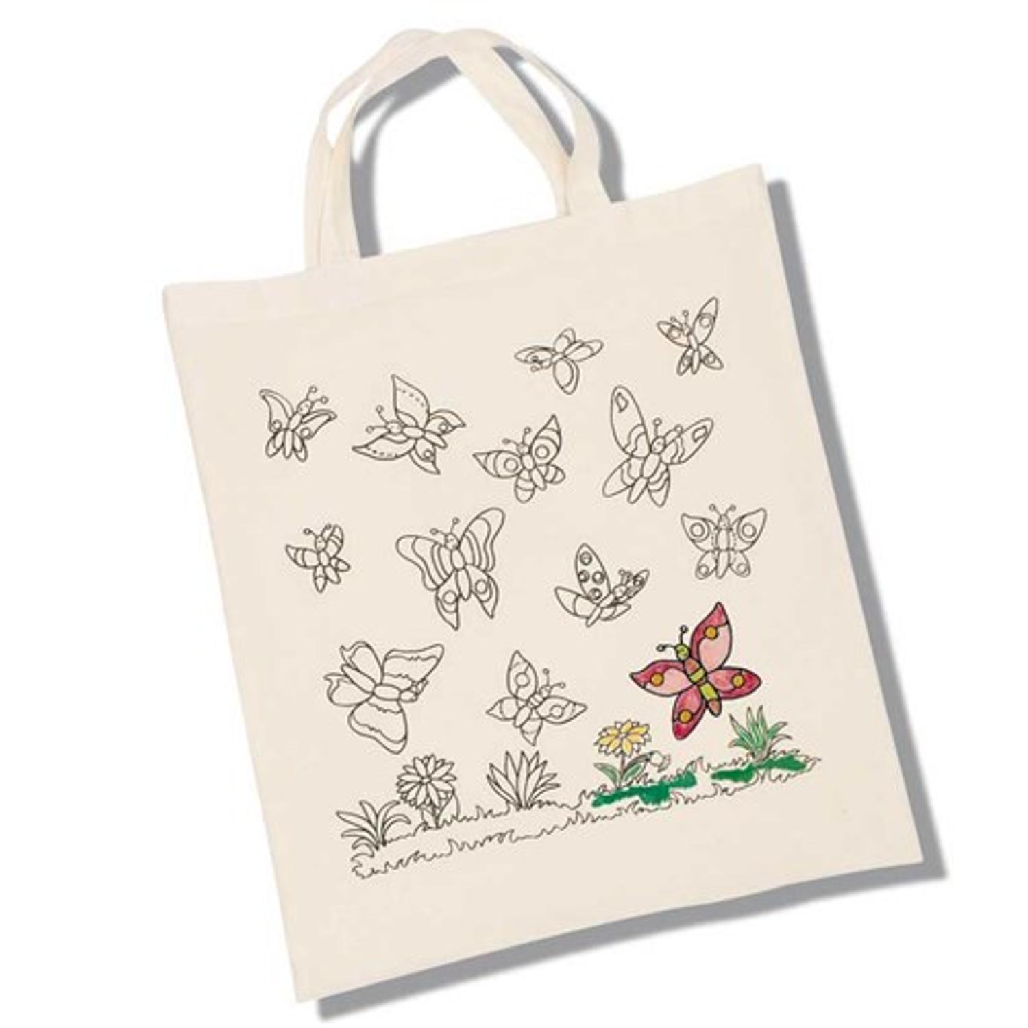 Een tasje met vlinders om zelf te versieren. Kleur de vlinders in en maak er zelf nog een tekening bij. Leuk om te tekenen en schilderen. Een tip om bij dit tasje te bestellen is artikel 90420, 8 vetkrijtjes.
