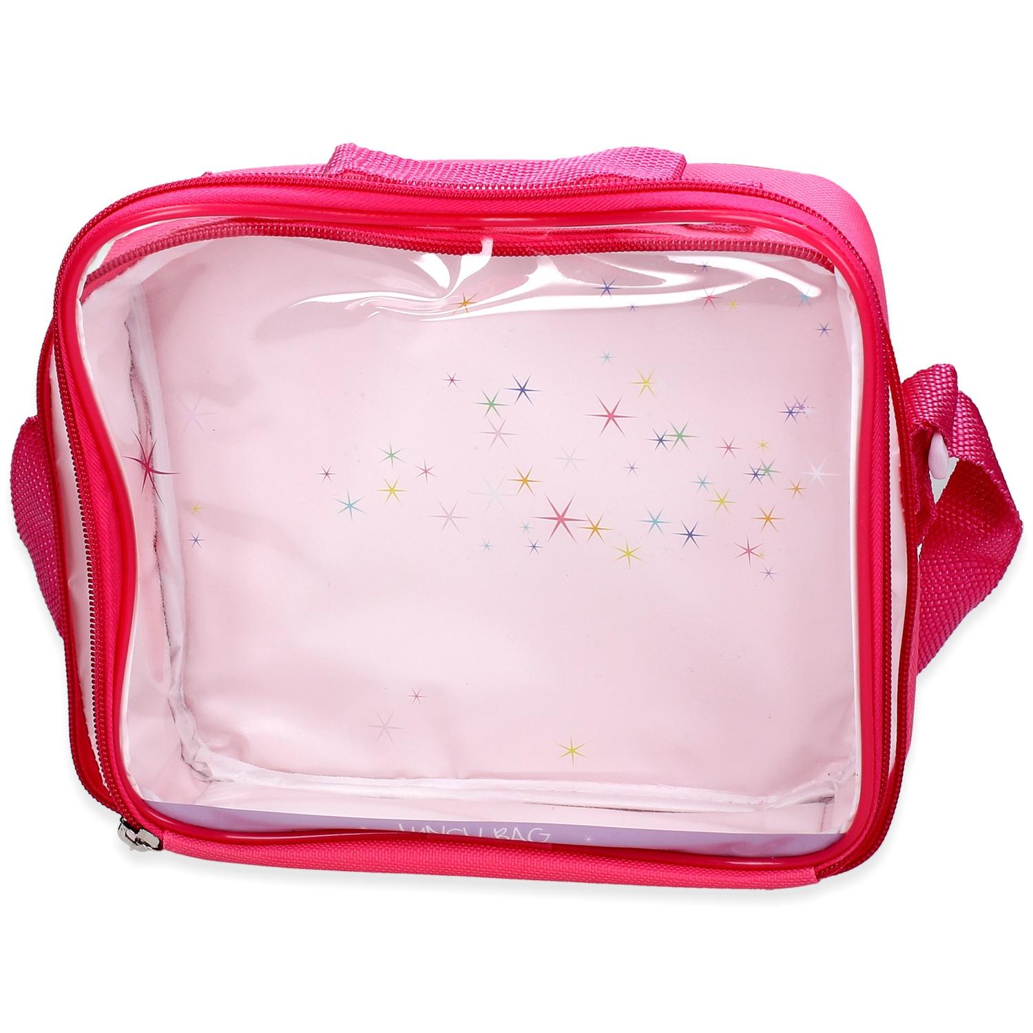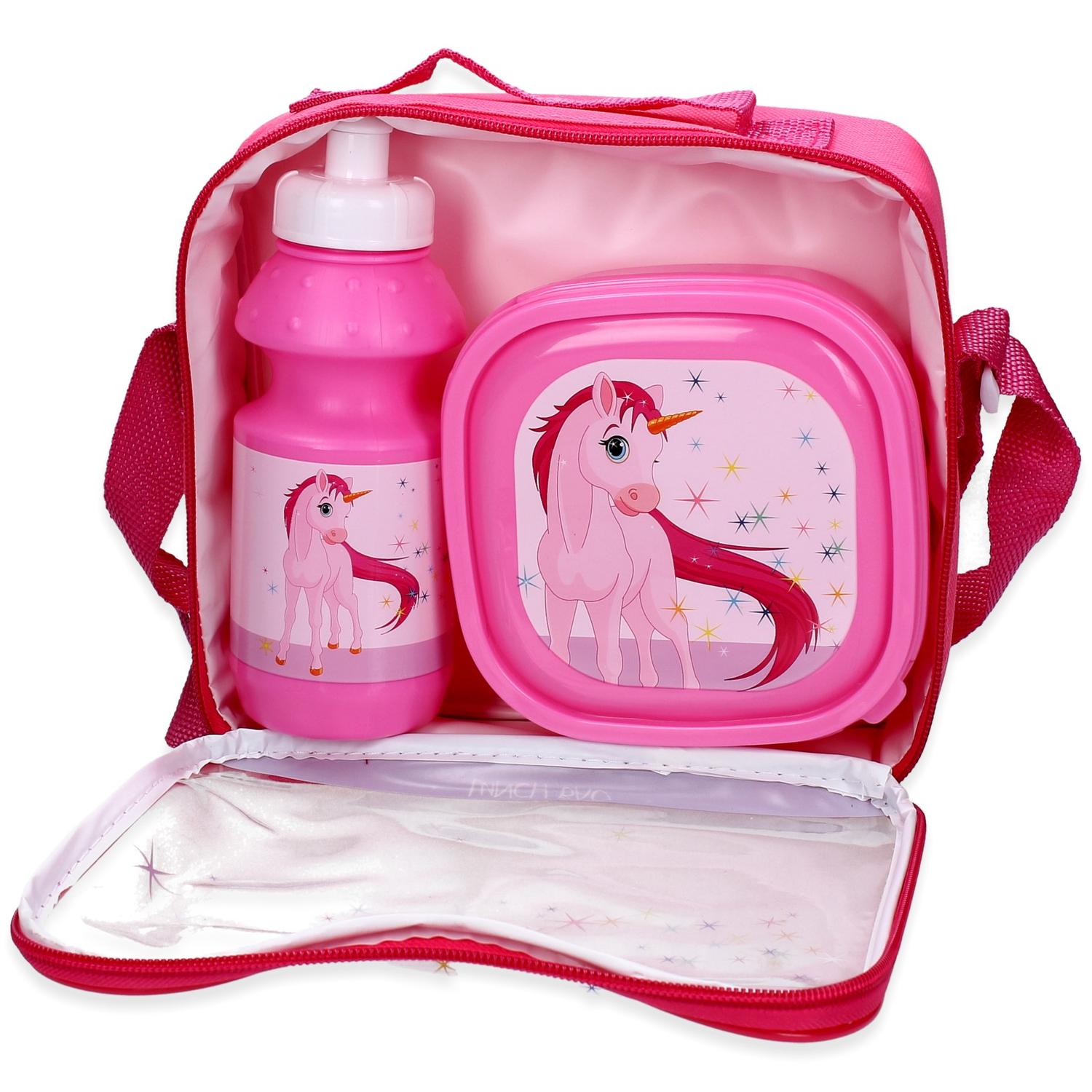 Perfect voor school, uitstapjes of onderweg – deze vrolijke set bestaat uit een lunchtas, een bijpassende drinkbeker en een snackdoosje, allemaal met een sprankelend eenhoornthema.