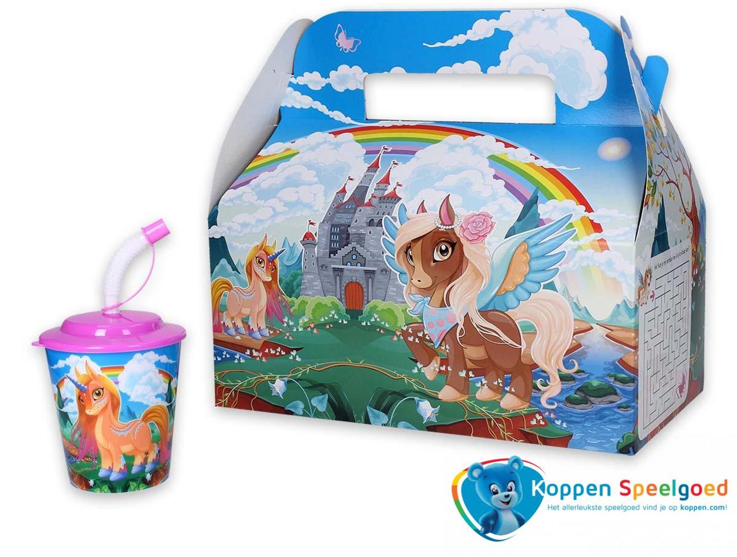 De set bestaat uit één menubox en één drinkbeker. Helemaal in het thema van eenhoorn. Met deze menubox set maak je zeker indruk op de kleintjes. Er zijn meerdere drinkbekers beschikbaar. Deze worden willekeurig door elkaar geleverd. De prijs is per set.